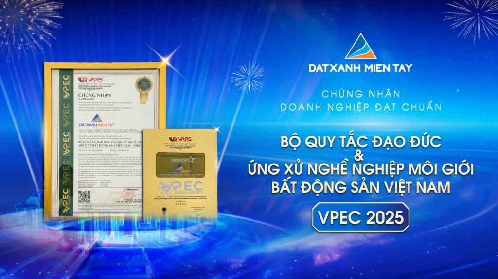 Chiều ngày 09.01.2026 tại Hà Nội, Đất Xanh Miền Tây vinh dự tiếp tục được chứng nhận đạt chuẩn “Quy tắc đạo đức và ứng xử nghề môi giới bất động sản Việt Nam – VPEC 2025” do Hội Môi giới Bất động sản Việt Nam trao tặng.